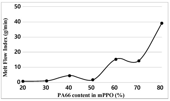 For each sample, MFI tests were performed three times. Figure 8 and Table 8 indicate the test results of the MFI. Experimental results demonstrated that the MFI increased with the increase in PA66 content in terms of the overall trend, with a drastic increase occurring when the PA66 content reached 60%. A decrease is observed at 50% of the PA66 content, and 70% of the PA66 content showed almost no difference with an MFI of 60%. Since PA66 has great flowability, it is reasonable to increase the MFI results of MFI as the with the increase in content. However, in the case of composite materials, material characteristics vary depending on miscibility and phase separation morphology; there are cases where it does not uniformly increase compared to the content [23,24].