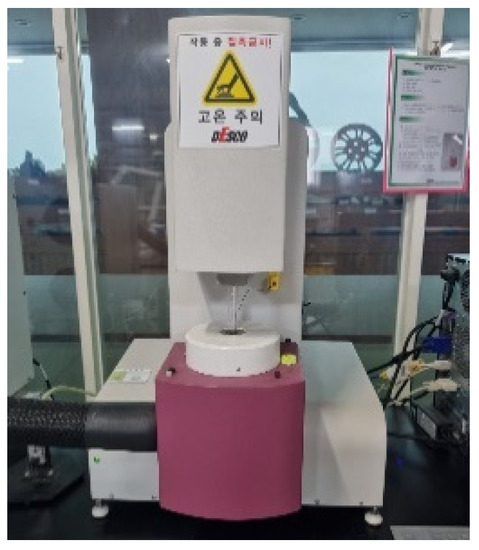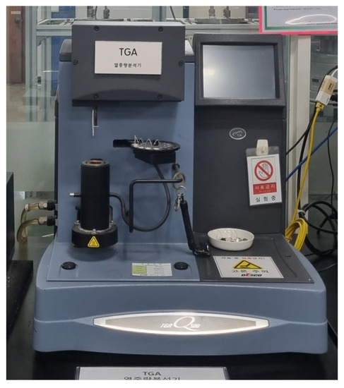 The pyrolysis temperature, which indicates heat resistance, was tested according to the ISO 11,358 standard [25], and the equipment and specifications of Thermo Gravimetric Analysis (TGA, Tinus Oslen) for the test are presented in Figure 9 and Table 9, respectively.