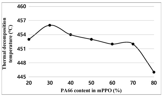 Figure 10 and Table 10 show the test results of pyrolysis temperature. The experimental results indicate that the pyrolysis temperature decreased as the content of PA66 increased, but the difference between the maximum and minimum values was insignificant at 10 °C.