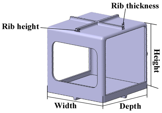 As shown in Figure 11, (1) the shape of the test specimens is a simplified form of the hydrogen fuel cell stack enclosure, and the dimensions are shown in Table 11. Moreover, (2) modeling was selected, including orthogonal ribs affecting warpage and shrinkage in injection molding [26,27].