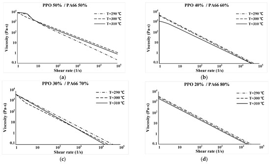 Viscosity results. (a) PPO 50%/PA66 50% (b) PPO 40%/PA66 60% (c) PPO 30%/PA66 70% (d) PPO 20%/PA66 80%.