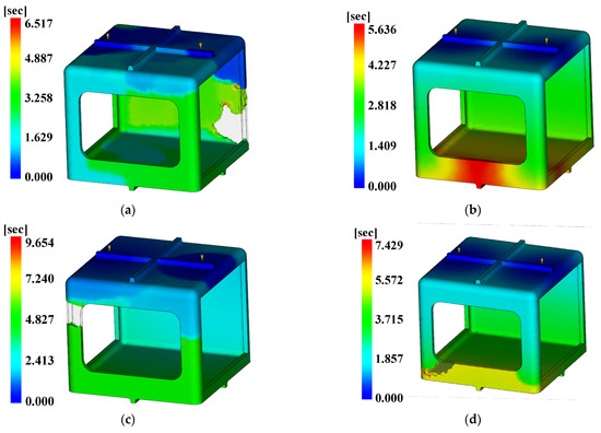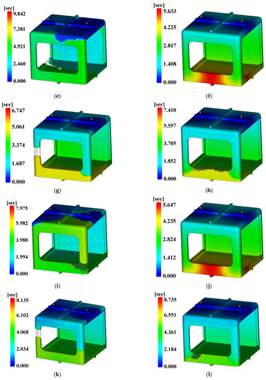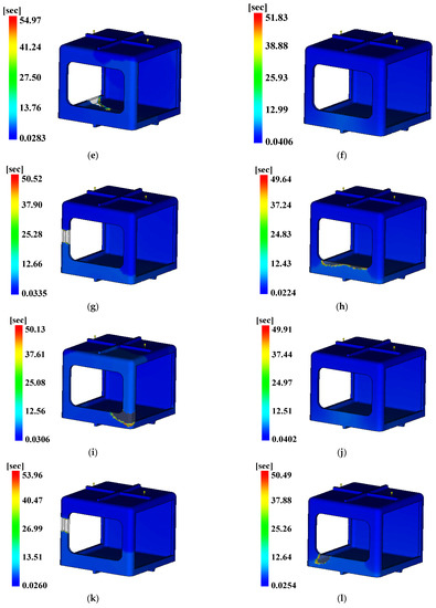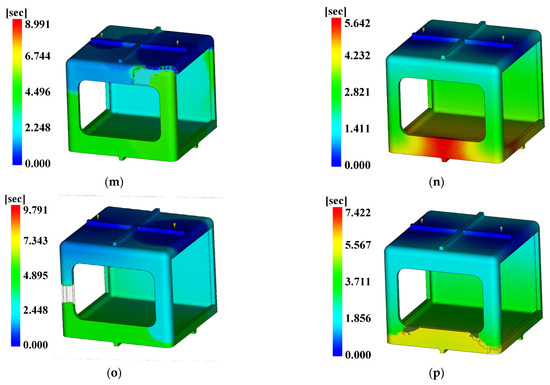 Fill time. (a) Case 1, (b) Case 2, (c) Case 3, (d) Case 4, (e) Case 5, (f) Case 6, (g) Case 7, (h) Case 8, (i) Case 9, (j) Case 10, (k) Case 11, (l) Case 12, (m) Case 13, (n) Case 14, (o) Case 15, (p) Case 16.