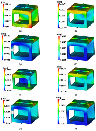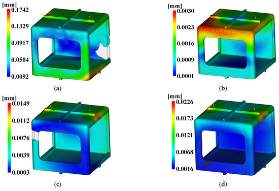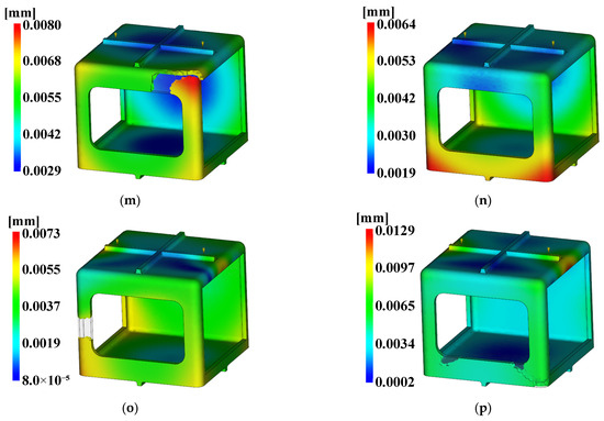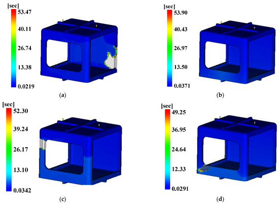 The three conditions with the maximum SN ratio were analysis conditions No. 6, 9, and 4 for the fill time, the maximum degree of deflection, and the time to reach ejection temperature, respectively. However, as shown in Figure 20, voids were observed in the analysis results, except in analysis conditions No. 2, 6, 10, and 14, and notably, the fluidity of all of the control factors was Level 2. Because products that have defects due to voids during injection molding are not distributable, the evaluation was performed after excluding the analysis conditions in which void areas were present. Table 31 and Table 32 present the results for each objective function and the calculation results on the SN ratio, respectively.