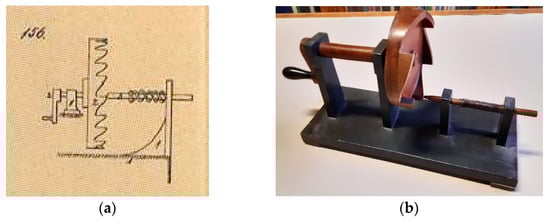 34], and the corresponding wooden model of a cylindrical cam disk, still existing in Bologna. According to the description by Masi: “The figure represents an eccentric in which the line is double curved and is placed on a cylindrical surface; hence the eccentric is also called cylindrical cam. By rotating the cam around its axis, the temple moves alternately in a direction parallel to the axis of rotation. The chain is closed by force by the action of a spring” [