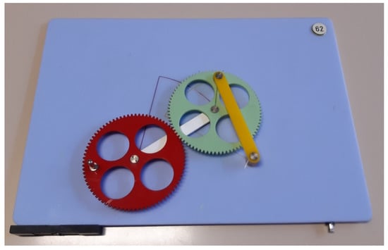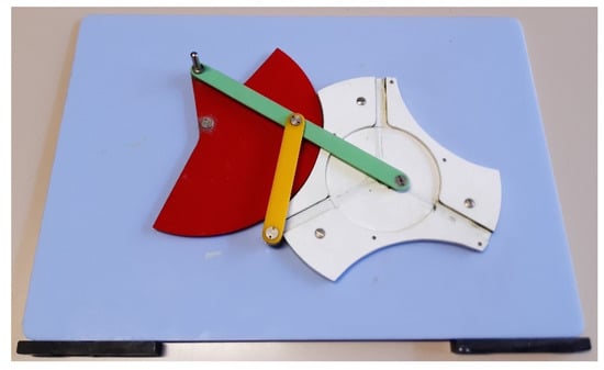 Figure 14 shows a four-bar linkage, in which the intermediate connecting rod (green) is the driver and is actuated by means of a gear (red). On the base (blue) there is an engraving depicting the maximum angular excursion of the rocker (white). The base of the model has dimensions 40 × 30 and there are feet to be able to place it vertically. On the back there is the manufacturer’s label: “