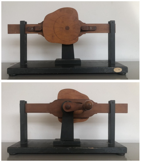Figure 13 shows an eccentric mechanism with several lobes. This mechanism–the most famous is the heart-shaped cam-has the property of having all its diameters of constant length, as evidenced by the diameters drawn on the front, and easily measurable. For this property, the eccentric can be closed within a frame between two wheels, the centers of which are placed at a distance equal to the diameter of the primitive curve of the eccentric. The model is mounted on a 40 × 20 cm base and has a height of approximately 25 cm. On the back there is a crank to rotate the cam manually, and to move the reciprocating rectilinear motion rod. On the back of the cam, “