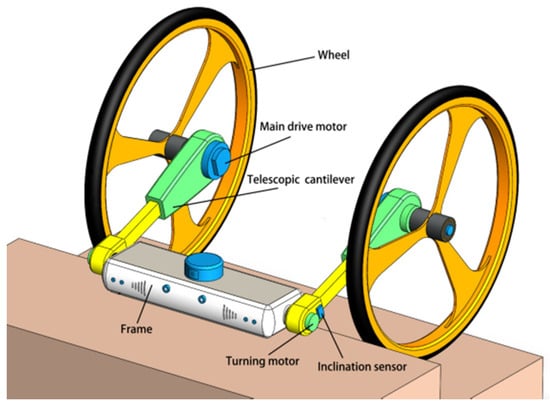 The structural model of the robot is shown in Figure 1. The main structure of the robot is composed of the frame, the left and right symmetrical telescopic cantilever and the wheel. The lower end of the telescopic cantilever is connected to the frame by the motor, which is used to control the attitude of the frame to maintain horizontal stability while the robot is moving. The upper end of the telescopic cantilever is equipped with a main drive motor to drive the wheel movement. The telescopic mechanism is installed inside the telescopic cantilever and forms a translation joint. In summary, the frame, the left and right telescopic cantilever and the left and right wheels constitute the two-wheel “4R+2P” configuration of the two-wheeled climbing stair robot using a combination of four rotation joints and two translation joints.