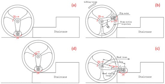 Gait simulation process diagram of “lifting and putting” during stair climbing: (a) the cantilevers drive the frame lifting due to the main drive motors’ blockage; (b) the frame is lifted to a certain angle and gradually lowered as the eccentricity increases.