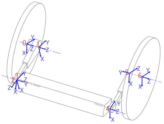 During the “lifting” gait of the robot when climbing stairs, since the left and right wheels of the robot are not moving, the pose transformation matrix from the left wheel coordinate system 0 to the right wheel coordinate system 6 can be defined as: