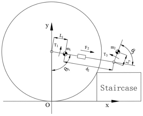 In Equation (8), Qi is the mutually independent generalized force corresponding to the generalized coordinates of the robot system, that is, the driving force for each joint of the robot system to be sought. After both the left and right wheels of the robot make contact with the stairs and block, the left and right telescopic cantilevers synchronously move to lift the frame. Therefore, in the “lifting” gait, the joints and connecting rods of the robot are left and right symmetrical mid-range structures. Ignoring the constraint force of the robot climbing a set of stairs across the wheels’ axis direction, a two-dimensional simplified model of the climbing stair process of the robot is constructed as shown in Figure 4.