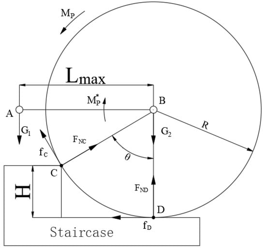 The prerequisite for the robot to complete the “approaching” action is that the robot remains steady on the stairs, and the wheels do not skid while climbing the stairs. The force analysis of the robot in the “lifting” gait is shown in Figure 5. The weight of the frame is G1, and the weight of the wheel is G2. Mp is the driving torque output by the main drive motor, Mp* is the anti-driving torque borne by the cantilever. The critical condition of wheel sliding is that the contact point C between the wheel and the stairs and the contact point D between the wheel and the ground have reached the critical sliding state. The friction forces of C and D are the maximum static friction force, namely: