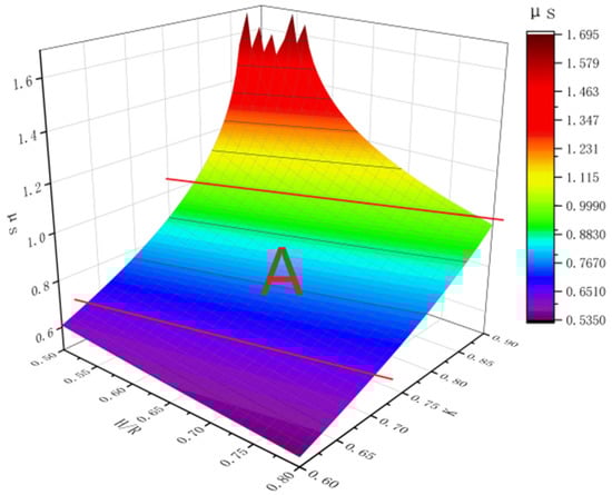 Through an analysis of the above results, the function image is shown in Figure 6. It can be seen from the figure that appropriately reducing the eccentricity ratio, K, is conducive to reducing the minimum static friction coefficient required by the robot to complete the stair climbing. In addition, a smaller eccentricity can be selected to achieve a larger climbing height–diameter ratio under the condition of a smaller static friction coefficient. The sliding friction coefficient between the common rubber tire and the concrete or dry tile ground is 0.6–1. Considering that the static friction coefficient between the common rubber tire and the ground is greater than the sliding friction coefficient, the interval A in the figure can be used as an optional interval for the design of the structural parameters of the robot.