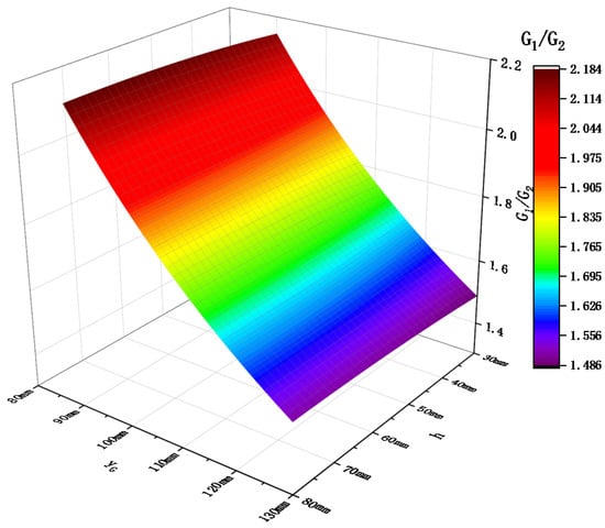 The standard step height of stairs is generally 150~170 mm, and the step width is approximately 300 mm; thus, the maximum step height H = 170 mm was taken. According to the two-wheeled stair climbing robot [], developed by T. Chen et al. at the University of Auckland, the height-to-diameter ratio was 0.29, and for the two-wheeled inverted pendulum climbing robot [,], developed by Takeshi Takaki et al. at Hiroshima University in Japan, the height-to-diameter ratio was 0.51. We expected a height-to-diameter ratio of 0.7. Therefore, the wheel radius, R = (170/0.7)/2 = 243 mm, and the maximum length of telescopic cantilever, LMAX = (300 + 486)/2 = 393 mm, were taken. The above parameters were substituted into Equation (19), and h and yG were taken as independent variables. The function’s image is shown in Figure 8. In order to reduce the peak load torque of the main drive motor in the “lifting” action, it was necessary to reduce the mass of the frame end as much as possible to reduce the eccentricity ratio, K; that is, G1/G2 should be as small as possible. The graph shows that the relative mass ratio G1/G2 of the frame should be reduced under the condition of ensuring the maximum climbing stair height and wheel radius of the robot remain unchanged. In addition to reducing the maximum elongation of the telescopic cantilevers, LMAX, it can also be realized by reducing the installation height of the flip motors, h, or increasing the distance between the frame centroid and the tail of the frame, yG.
