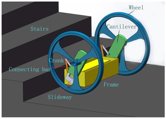 Multiple mono-walking mechanisms are combined together to form a composite walking mechanism. The composite walking mechanism is mainly composed of a foot–track composite [,] and a wheel–foot composite. Although the foot–track composite walking mechanism can better achieve obstacles, such as climbing stairs and large-angle slopes, it still retains the shortcomings of easy “sliding” of the tracked chassis and also increases the complexity of the control system. In the wheel–foot composite walking mechanism [,], the structure of the two-wheel–foot composite walking mechanism is simple and small. Compared with the multi-wheel–foot composite walking mechanism, the two-wheel–foot composite walking mechanism can decompose the continuous and complex multilevel stair climbing action into multiple discrete single-level stair climbing actions, that is, “reset” after completing the obstacle climbing action of the before-level stair, thus avoiding the problem of “misstep and misplace”.