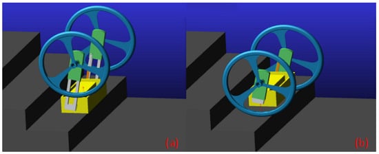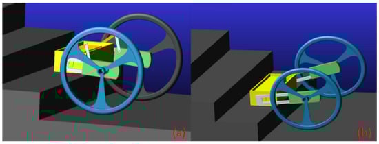 “Retraction and approaching” stair climbing gait simulation process diagram: (a) the two wheels are turned over to the steps of the frame; (b) the cantilevers drive the wheel back and the robot touches the next stair.