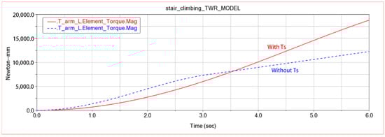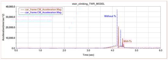 As shown in Figure 11, the blue line represents the output torque of the input function of the cantilever without TS, and the red line represents the output torque of the input function of the cantilever with TS. Obviously, the output torque of the cantilever continues to grow linearly after 3.5 s of cantilever begins to stretch after the input function of the cantilever angle ring is added to the “excess input TS”. Thus, the frame obtains a continuous linear growth of the “lifting” torque during the cantilever elongation to reduce the impact of the frame and the stairs. In Figure 12, the red and blue lines are the frame centroid acceleration with and without Ts. The peak value of the frame centroid acceleration after adding TS is only half before, which achieves the purpose of reducing the impact received by the frame during stairs climbing.
