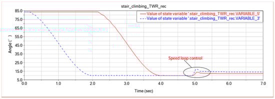 The wheel speed loop control is very important in the “retraction and approaching” gaits. Since the step width of the stair is small, the robot needs to retain a forward force of the body to maintain its own stability in the reset process. As shown in Figure 14, the red line is the vertical inclination change curve of the left telescopic cantilever, and the blue line is the vertical inclination change curve of the right telescopic cantilever. After adding “speed loop control”, the curve shows an upward trend, indicating that the main drive motor maintains a certain forward driving force under the “retraction” gait. If the speed loop control is removed, the robot is prone to fall from the stairs due to uneven ground or torque oscillation generated during the adjustment of body posture.