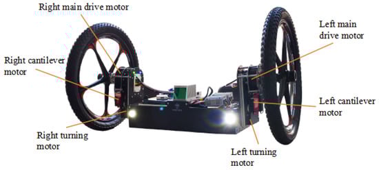 Through the analysis and design of the above two critical constraints, the robot prototype is shown in Figure 15. The main body was composed of left and right wheels, left and right telescopic cantilevers and a frame. The overall size was 500 × 950 × 500 mm. The wheels were 500 × 54 mm mountain bike wheel. The main body and frame of the telescopic cantilever were carbon fiber materials. The weight of the frame was 9.88 kg. The weight of the cantilever and the side wheel was 2.46 kg. The specific parameters and experimental performance of the robot are shown in Table 2.