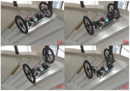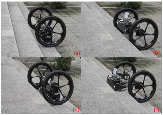 Figure 20 shows the test process of the robot autonomously descending stairs. The navigation system lets the robot move slowly along the given direction. When the robot starts to fall down the stairs, the wheels roll to the next stairs first, but the body still maintains its position under the action of inertia, so that the overall centroid of the robot is still located on the current stairs, which ensures the stability of the robot going downstairs. During this process, the robot’s posture will look down first, so that the laser radar can detect whether there are obstacles hindering the robot’s movement in the process of downstairs. When it is confirmed to be safe ahead, the robot will continue to complete the downstairs process.