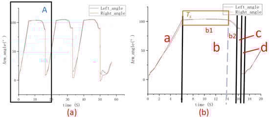 In the prototype climbing experiment, we measured the experimental data of the vertical inclination angle of the left and right cantilevers and the current of the left and right main driving motors in the climbing process of the robot under the condition of two rounds of blocked rotation. The left main driving motor was motor 1, and the right main driving motor was motor 2. The measurement results of each data are shown in Figure 17 and Figure 18. Among them, “a, b, c, and d” were separated by black solid lines, representing the four stages of the robot climbing gait “lifting, putting retraction and approaching”, respectively. The interval b1 and b2 are two subintervals separated by the blue line of the interval b, and b1 denotes the process of cantilever stretching to the longest in the gait released by the robot. b2 Represents the process in which the frame is lowered at the longest cantilever in the gait of the robot.
