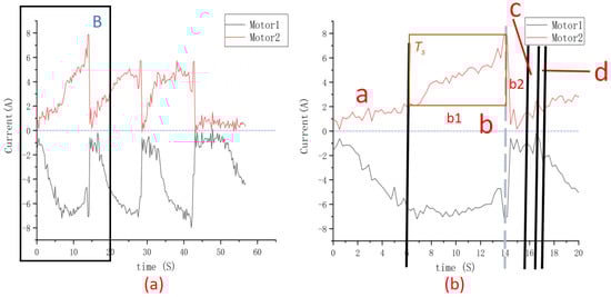 Current variation curves of the main drive motor for when the robot climbed the stairs: (a) the robot climbs the stairs for 57 s; (b) the amplification diagram of part B in Figure (a).