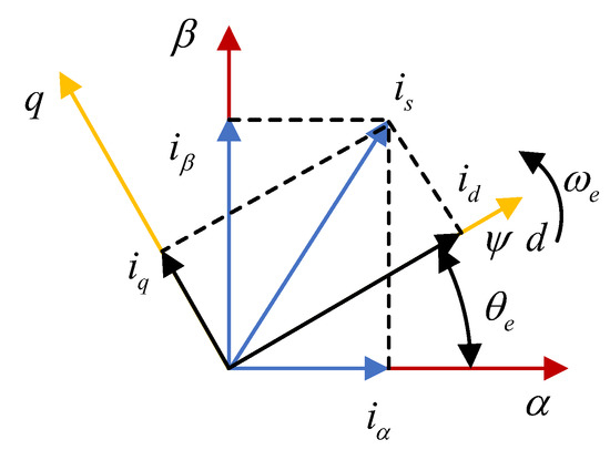 PMSM vector diagram under d-q coordinate and α-β coordinate.