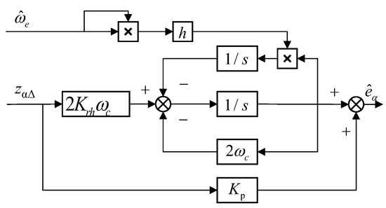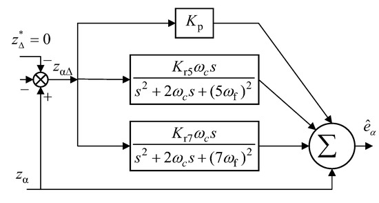 Based on the open-loop transfer function of the QPR filter shown, its structural block diagram is shown in Figure 3. Taking the αaxis as an example, h is the harmonic order, the estimated electrical angular velocity is the resonant frequency of the MPF, and the output is the filtered back EMF.