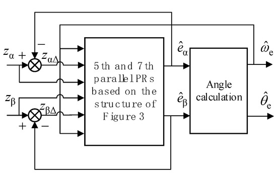 Firstly, multiple PR controllers were designed in parallel to extract the negative sequence components of the 5th and 7th harmonics in the back EMF, and then the extracted components were compensated into the back EMF, which achieved the effect of suppressing harmonics. The closed-loop structure is shown in Figure 5.