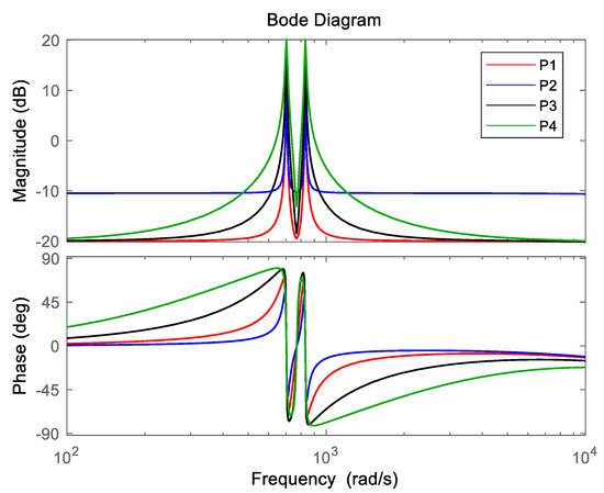 The motor parameters in Table 1 are substituted into the transfer function of Equation (23), L = 0.15 mH, R = 0.1 Ω. The value of the switching gain of k is 200, and Figure 6 shows the system bode diagram under different parameters, such as P1 (Kp = 0.1, Kr5 = 3, Kr7 = 5, ωc = 2), P2 (Kp = 0.3, Kr5 = 3, Kr7 = 5, ωc = 2), P3 (Kp = 0.1, Kr5 = 5, Kr7 = 5, ωc = 2), and P4 (Kp = 0.1, Kr5 = 3, Kr7 = 5, ωc = 5). The resonant frequency is defined as 314 rad/s.