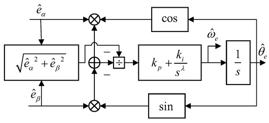 Tradition SMO rotor angular velocity and velocity were calculated using arctangent, as shown in Equations (15) and (16), which often have poor accuracy. An improved FN-PLL was designed to improve the calculation accuracy and eliminate the high-frequency noise. Figure 8 and Figure 9 are the block diagrams of the FN-PLL structure. Firstly, the back EMF was normalized, and then fractional integration was used instead of integer integration.