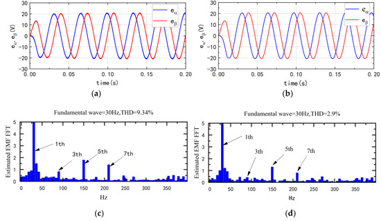 In order to verify the filtering effect of the improved rotor position observer, the back EMF results of the traditional SMO and the improved SMO in this paper were compared and analyzed. Figure 12a shows the back-EMF waveform of the traditional SMO running at 450 rpm under half-load conditions. It can be seen from the figure that, although the back EMF waveform presented a sinusoidal shape, it was accompanied by small-amplitude chattering in the waveform. Figure 12c is the FFT analysis of the traditional SMO back EMF. The back EMF mainly existed in the fifth and the seventh harmonics. Figure 12b shows the modified SMO back EMF. The back EMF was smoother than that in Figure 12a, and the chattering was significantly reduced. Through the FFT analysis of the improved SMO back EMF in Figure 12d, the fifth and seventh harmonics in the back EMF were significantly reduced, and the total harmonic was only 2.9%.