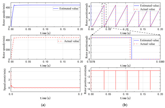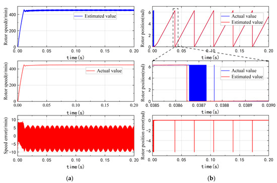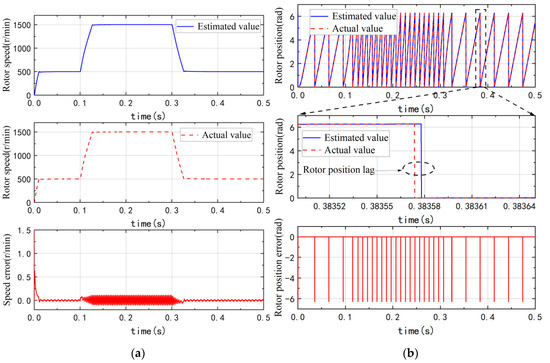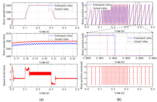 As shown in Figure 16, using the improved SMO control strategy, the estimated speed and actual speed of the motor were basically coincident when the speed was 500 rpm, and when the reference speed changed, the estimated error was about 0.1 rpm at most. At the same time, from the simulation results of the traditional SMO rotor position in Figure 15b and the improved rotor position in Figure 16b, due to the LPF existing in the traditional SMO and the phase compensator, it can be clearly seen that the rotor position lag was relatively large, while the improved SMO obtained higher control accuracy for the rotor position estimation due to the use of MPF.