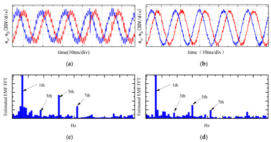 It can be seen from the FFT analysis of the waveforms in Figure 18c that the 5th and 7th orders of the back EMF harmonics occupied a large proportion, which is also one of the reasons for the large speed and rotor position errors. The content of the 5th and 7th harmonics in the back EMF after proportional resonance filtering in Figure 18d was significantly reduced.