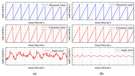 Rotor position experimental results: (a) traditional SMO rotor actual position, estimated position and position error; (b) improved SMO rotor actual position, estimated position, and position error.