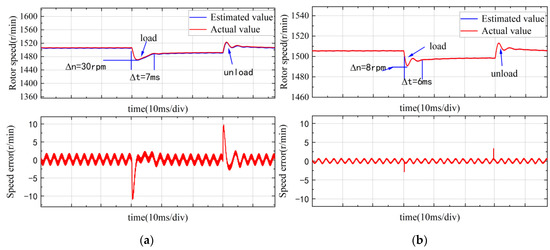 In order to analyze the anti-disturbance response effect of the improved SMO control, the torque was first abruptly changed from 0 N to 10 N and then suddenly changed to 0 N. Figure 21a shows the experimental results of loading and unloading of traditional SMO control. It can be seen that, after loading, the speed dropped by 30 rpm, the time to return to a steady state after the load changes was about 8 ms, and the sudden change of load also increased the speed error instantly. It can be seen from the waveform of the improved SMO speed in Figure 21b that when the load changed abruptly, the speed dropped by about 5 rpm, and the time to return to a steady state after the load changes was about 6 ms. It can be seen from the comparison that the improved SMO proposed in this paper has a great improvement compared with the traditional SMO in the case of sudden load changes; not only are the speed and rotor position errors smaller in the steady state, but they also are under the load. In the case of sudden change, it can maintain good dynamic performance and ensure the control accuracy of the system.