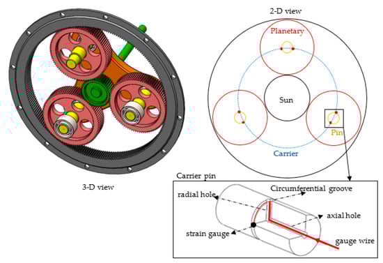 To overcome these negative points, Boguski et al. [54] represented a new method to calculate the LSR based on stress amplitudes. In their approach, each planet pin was strain gauged, as shown in Figure 2, and it is required that the planetary gear set operates in a fixed carrier configuration such that the strain signals could be extracted without the use of a slip ring.