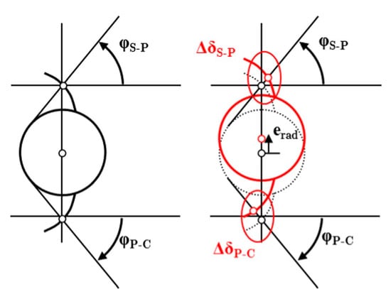 According to the direction of the error, the tangential component of the positioning error has the effect of advancing or delaying the starting of the contact of teeth of the planet with the error. As can be seen in Figure 4, there is a planet with a positive error . The change in the geometric overlap for the sun–planet (Δδp-s) and ring–planet (Δδp-r) meshes may be noticed when the planet center moves in relation to its theoretical location. The torque imparted via the sun–planet–ring path, with error, is influenced by these differences in the geometric overlaps, which results in a change in the related contact forces in both meshes. When the error is positive, and the torque is in the opposite direction, it causes a preload on the planet with the error.