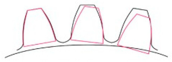 Run-out is a term that refers to the location errors that define the precision of the teeth on a gear and hence the accuracy of the transmission. Indeed, run-out is a concept that describes the inaccuracy of the tooth radial placement in relation to the pitch circle (see Figure 6). It is the most considerable difference between all teeth’s nominal or theoretical radial positions and their actual or working measured positions. The run-out might result in structural integrity issues. Run-out creates an accumulation of pitch variation, which leads to non-uniform motion and transmission error. Run-out has a domino impact, affecting the majority of other gear quality metrics, such as involute and/or tooth shape, index and/or pitch error, lead deviation, and noise and vibration [5,63,73].