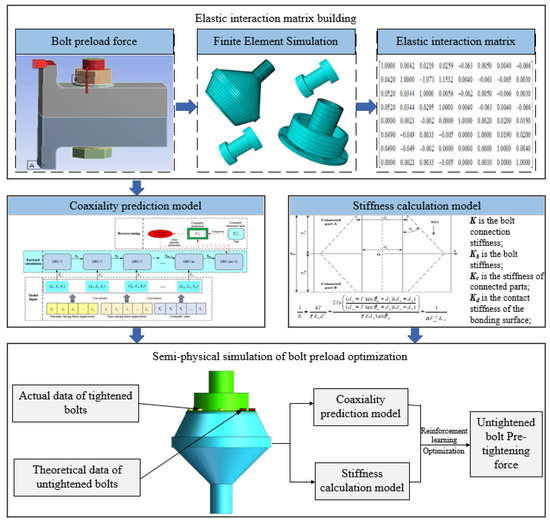 This paper proposes a semi-physical simulation optimization method for the bolt tightening process on the basis of reinforcement learning. Firstly, by studying the elastic interaction mechanism between the bolts, the elastic interaction matrix was established using finite element simulation data. On this basis, a coaxiality prediction model for the bolt tightening process was established using the GRU (gate recurrent unit) network to realize the prediction of coaxiality in the bolt tightening process. Then, through the analysis of the bolt connection stiffness, a stiffness calculation model containing the bolt stiffness, the stiffness of the connected parts, and the contact stiffness of the joint surface in series was constructed to realize the calculation of the stiffness during the bolt tightening process. Finally, with the bolt preload force as the optimization variable, coaxiality and stiffness as the optimization target, and the tightening torque and preload force of the installed bolts in the actual assembly process as the constraints, a semi-physical simulation optimization model of the bolt tightening process was established using reinforcement learning to realize the optimization of the bolt tightening process. Moreover, through the semi-physical simulation optimization method, the bolt tightening process can be installed and adjusted at the same time.