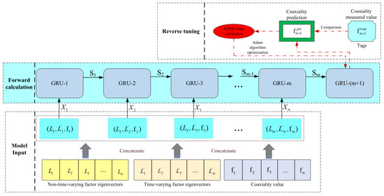 Step 3: The GRU (gate recurrent unit) network was used to build a coaxiality prediction model in the bolt tightening process. Divided into n time steps according to the number of bolts, when the tth bolt is tightened, the actual preload force of t bolts and the theoretical preload force of n-t bolts and the assembly influence factors collected in stpe1 are taken as input, and the final coaxiality is taken as output to realize the prediction of coaxiality during bolt tightening. The coaxiality prediction model is shown in Figure 7.