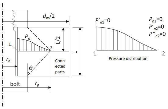 Considering that the bond surface stiffness will be mainly influenced by the contact pressure, it is necessary to obtain the contact pressure of the bond surface before calculating the bond surface stiffness value. For the connected parts with the same thickness, the outer diameter . If there is no shim between the connected parts, then the distribution of the contact pressure can be considered as a fourth-order polynomial [22] with respect to the radius shown in Figure 9, where is the half-top angle assumed for the cylinder, then