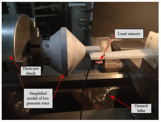 Coaxiality acquisition using a laser sensor was used, as shown in Figure 10; the model was a Panasonic HG-C1030 miniature laser displacement sensor, with an accuracy of 10nm and sampling frequency of 800 Hz. An ordinary lathe was used to provide a rotary reference for measurement, a model CS6150 of Baoji Machine Tool Factory, with spindle speed from 9 to 1600 rpm and spindle power of 7.5 KW. A three-jaw centering chuck was used for clamping the measured parts.