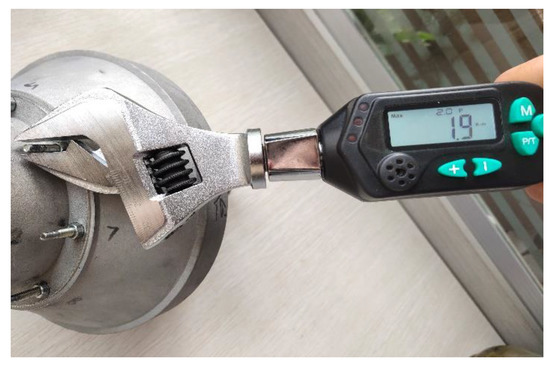 The preload force of the rotor bolt set was applied using the Yarick digital electronic torque wrench, as shown in Figure 11. Torque wrench alarm range was 1.5~30 N·m, and accuracy was ±2%. During the experiment, the preload force to be applied was converted into the tightening torque by Equation (20), and the tightening torque to be applied was set before applying the force; the torque wrench would beep and stop applying the force when the set value was reached during the tightening process.