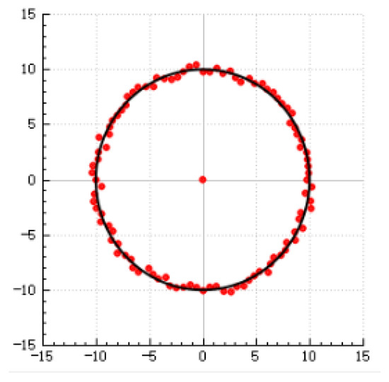 Laser sensors were used to measure the runout at the position of the disk rotation axis after each tightening step. The least squares method was used to fit the runout values collected at several points to a circle, and the average of the horizontal and vertical coordinates of all points on the circle was defined as the circle center of the circle, with the offset between the position of the fitted circle and the standard circle center being used as the coaxiality of the rotor after assembly. A circle fitted using the least squares method is shown in Figure 12.