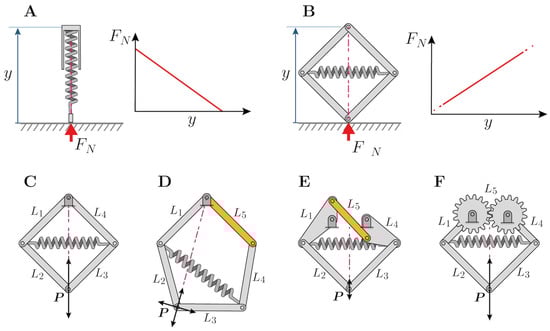 The telescopic prismatic mechanism (A) and hinge rhomb linkage (B), with their characteristic ground reaction force with longitudinal displacement graph. From (C–F), synthesis of a synchronous hinge rhomb linkage using a pair of synchronising gears. Dotted line extremes in graph B highlight singular or nonlinear behaviour of with y for specific geometry configurations; these aspects will be discussed in subsequent sections.