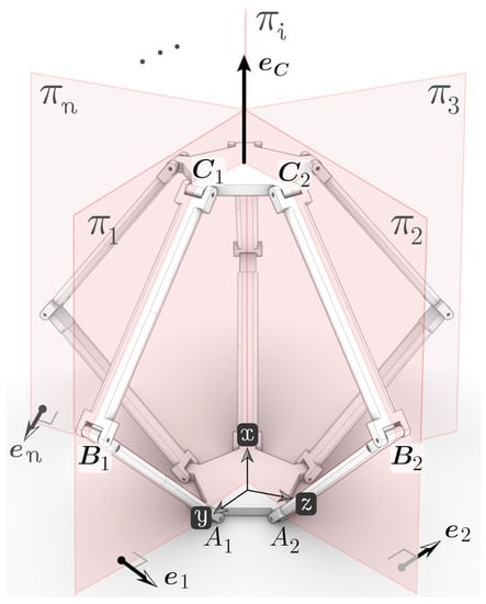 In the analysis at hand, the degree of freedom of the terminal connector of the i-th kinematic chains is analysed first. Figure 2 shows the the schematics of the conceptual mechanism. For geometric convenience, the unit vector denotes the direction of the plane, while the unit vector represents the direction of the intersecting line among planes that can be computed with Equation (A2). Note that any other nonparallel two planes may also be used to define .