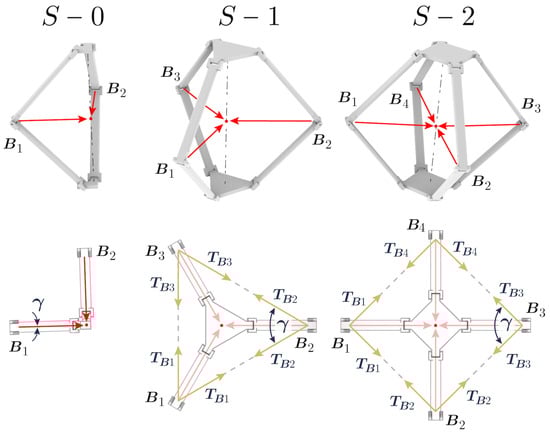 The presented family of mechanisms also shows tensile loading arrows created by the spring, which originally connected the intermediate joints of the two dyads (hereinafter referred to as knee) in the hinge rhomb linkage in Figure 1A. Note that the first fundamental configuration, , shows no rotational symmetry; that is, the angle between the two dyad planes () is different from radians. Conversely to , configurations with rotational symmetry are advantageous from the point of view of load distribution (Figure 3). The second configuration , highlights one-dyad redundancy with respect to the fundamental configuration , with rotational symmetry of order 3 ( between planes). Similarly, other symmetric configurations of higher order can be formed without affecting the mechanical behaviour of the linkage.