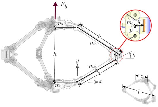 The approach implemented in the CLOVER robot design is based on the configuration illustrated in Figure 4, due to geometric simplicity in line with our third design goal in Section 1.1. Additionally, is set for the sake of a simplified anchorage design for the drive as discussed later in this section. The leg length is a, leg swing angle is , the fixed leg separation distance is c, l is the variable distance between fixed points in the knees serving as anchorage points for the drive, the variable linkage height is h, and the thrust force is . For the sake of practical implementation, it is assumed that b is the variable length running from the analysed body-leg joint to the effective anchorage point of the elastic element; p and q are lengths that relate a and b. Note that p and q could be used to capture in-plane offsets between the axis of rotation of the knee revolute joint, and the practical anchorage point of the elastic element. In our knee design, p and q are constant lengths capturing manufacturing trade-offs discussed later in Section 3.