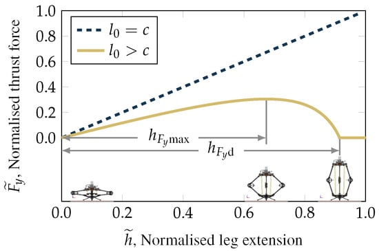 To illustrate the thrust profile, the specific case of a single pin knee joint, i.e., recovering the simplicity of the configuration, and equal leg length segments () in Equation (6) can be analysed. The spring in this robot design will be an elastic material, which is assumed to only apply a load to the system when it extends beyond its natural length, and no load when it is compressed. This is modelled in the system using a Heaviside step function , collapses the thrust force to zero for cases where the spring is compressed.