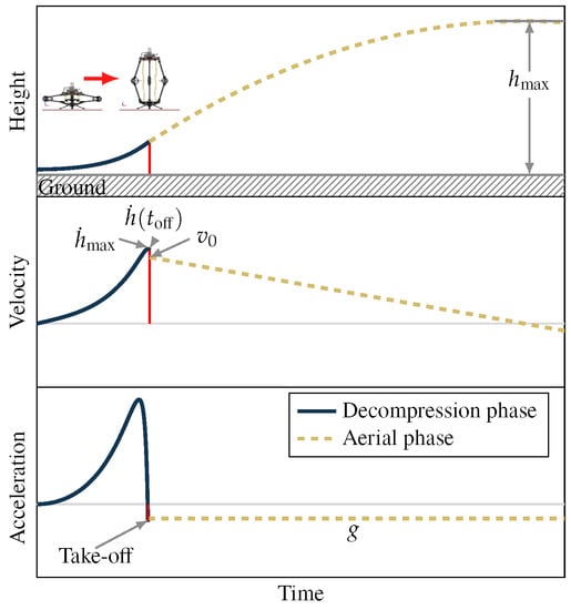 After the total mass reaches its maximum velocity (), the effect of gravity starts to slow down the motion but the upward movement continues while the robot is still on the ground. The instant of take-off, , occurs when the ground reaction force in Equation (20) equals zero.